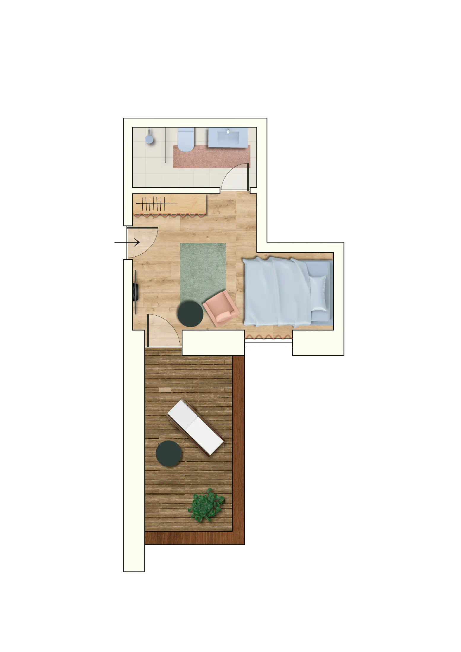 • Wohn- und Schlafbereich mit Einzelbett, Sitzgelegenheit und hochwertiger Bettwäsche