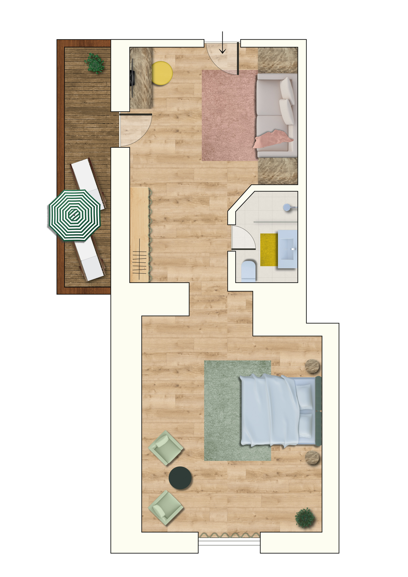 • Separater Wohnbereich mit gemütlichem Sofa und Schreibtisch