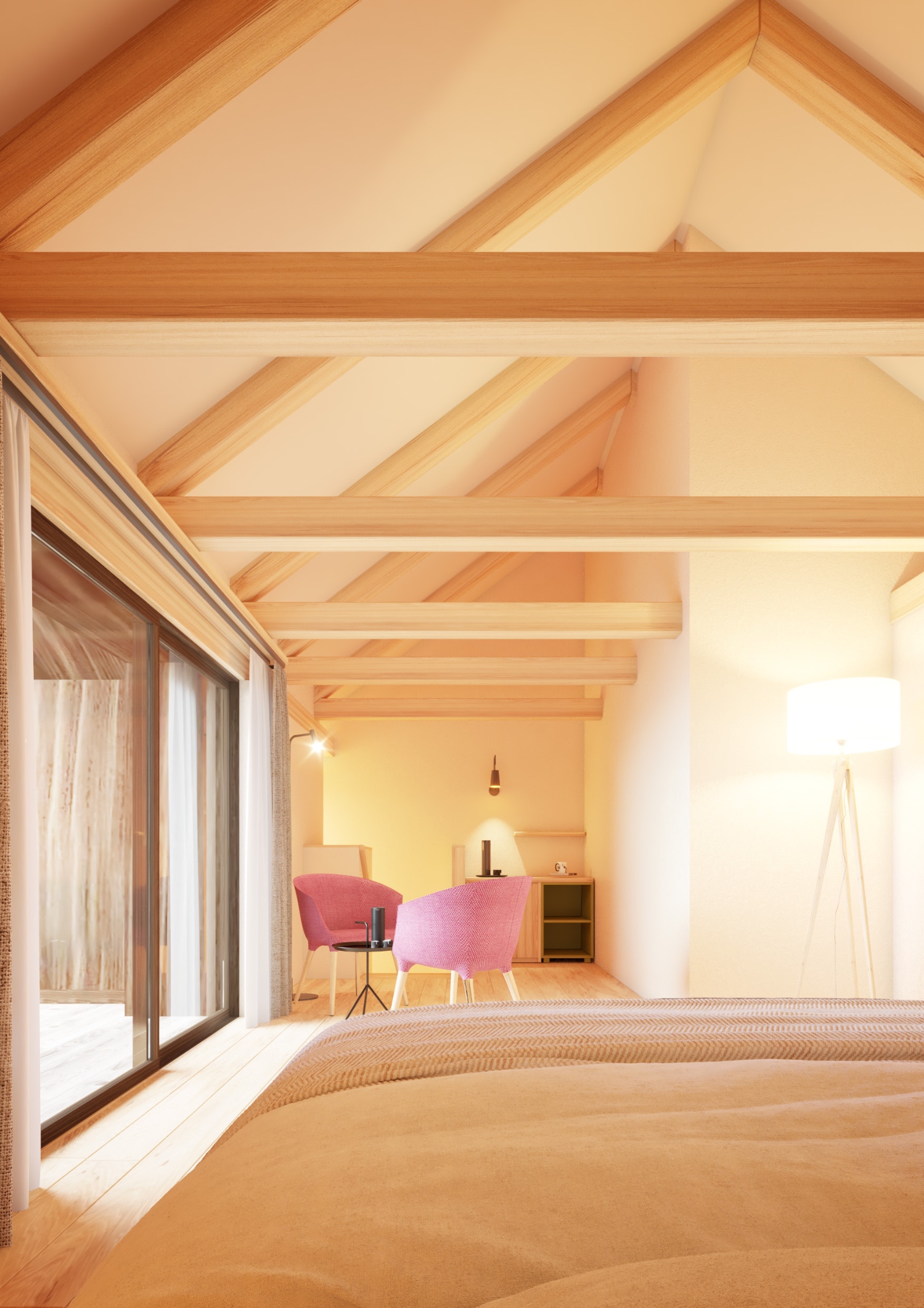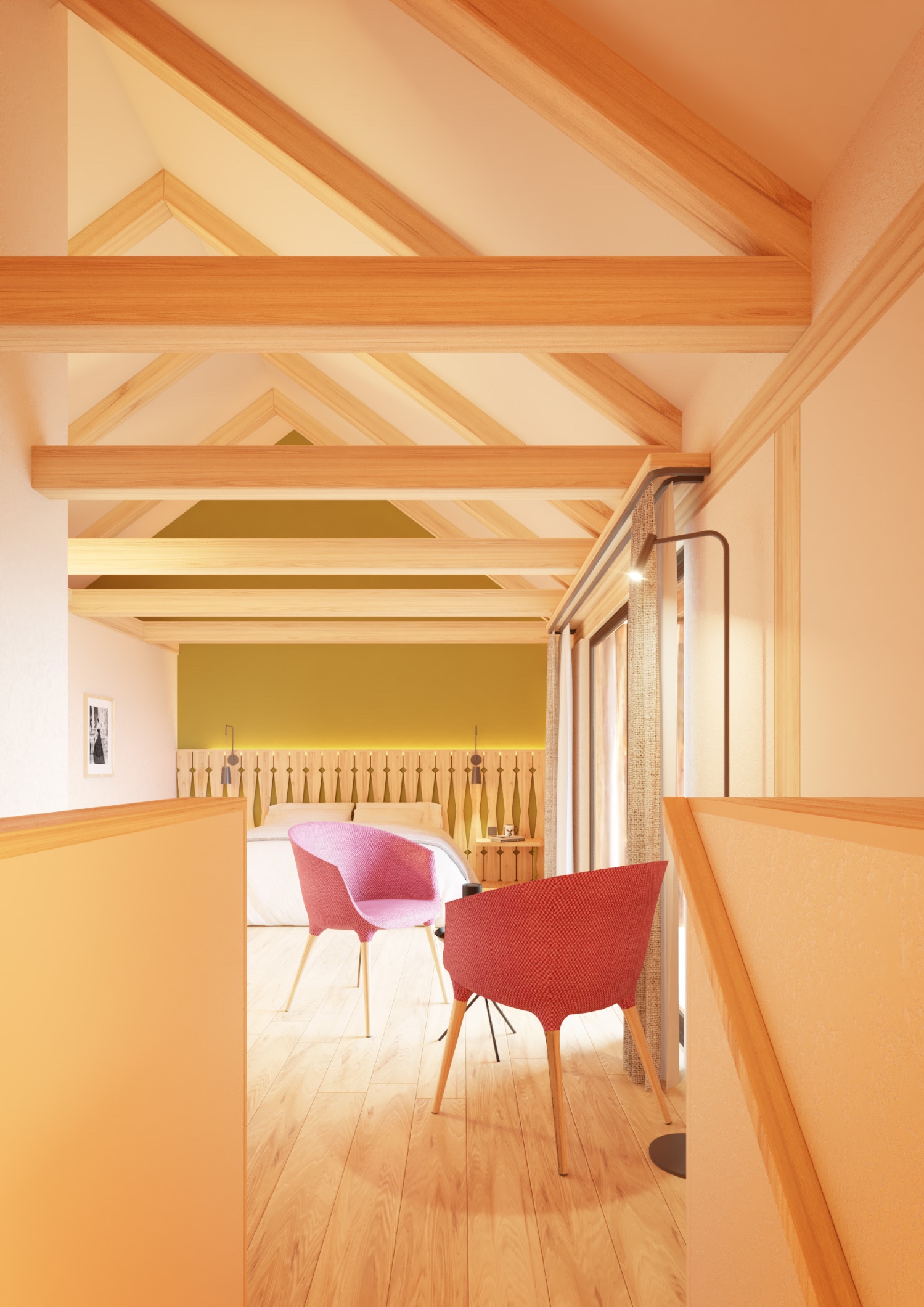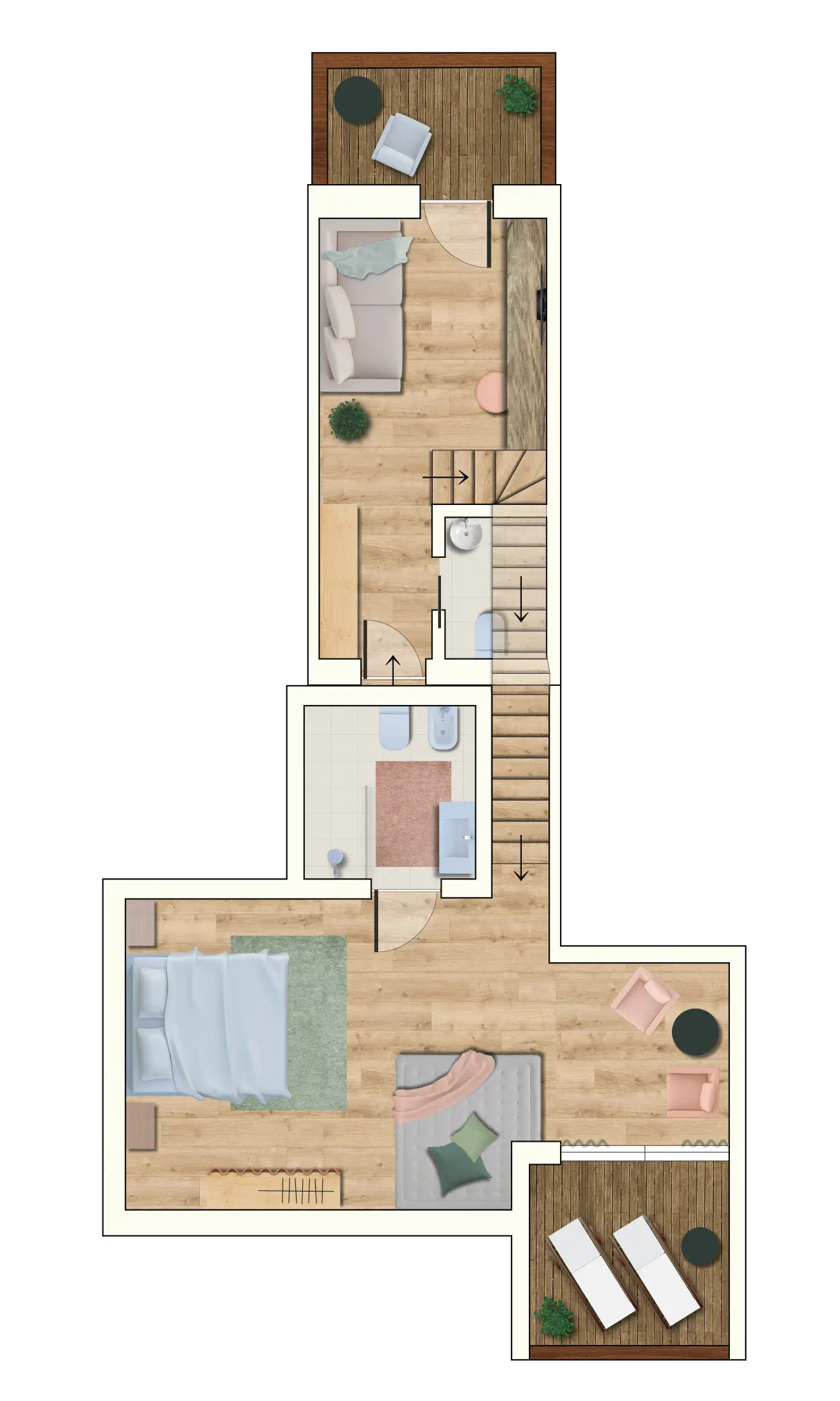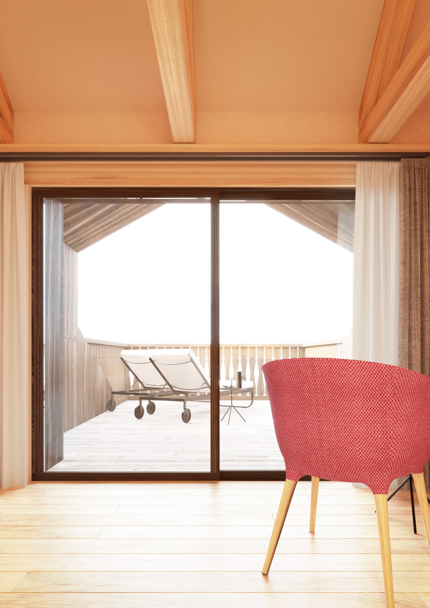Auf zwei Ebenen – stilvolle Suite mit viel Platz, Balkon, Terrasse sowie Doppelblick auf Dorf und Berge.