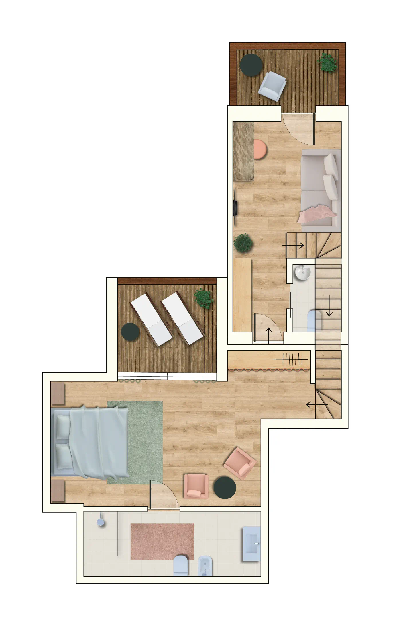 • Schlafzimmer mit Doppelbett, hochwertiger Bettwäsche, Sitzgelegenheit und großzügigem Badezimmer mit Dusche, WC, Föhn und Handtüchern auf der oberen Ebene