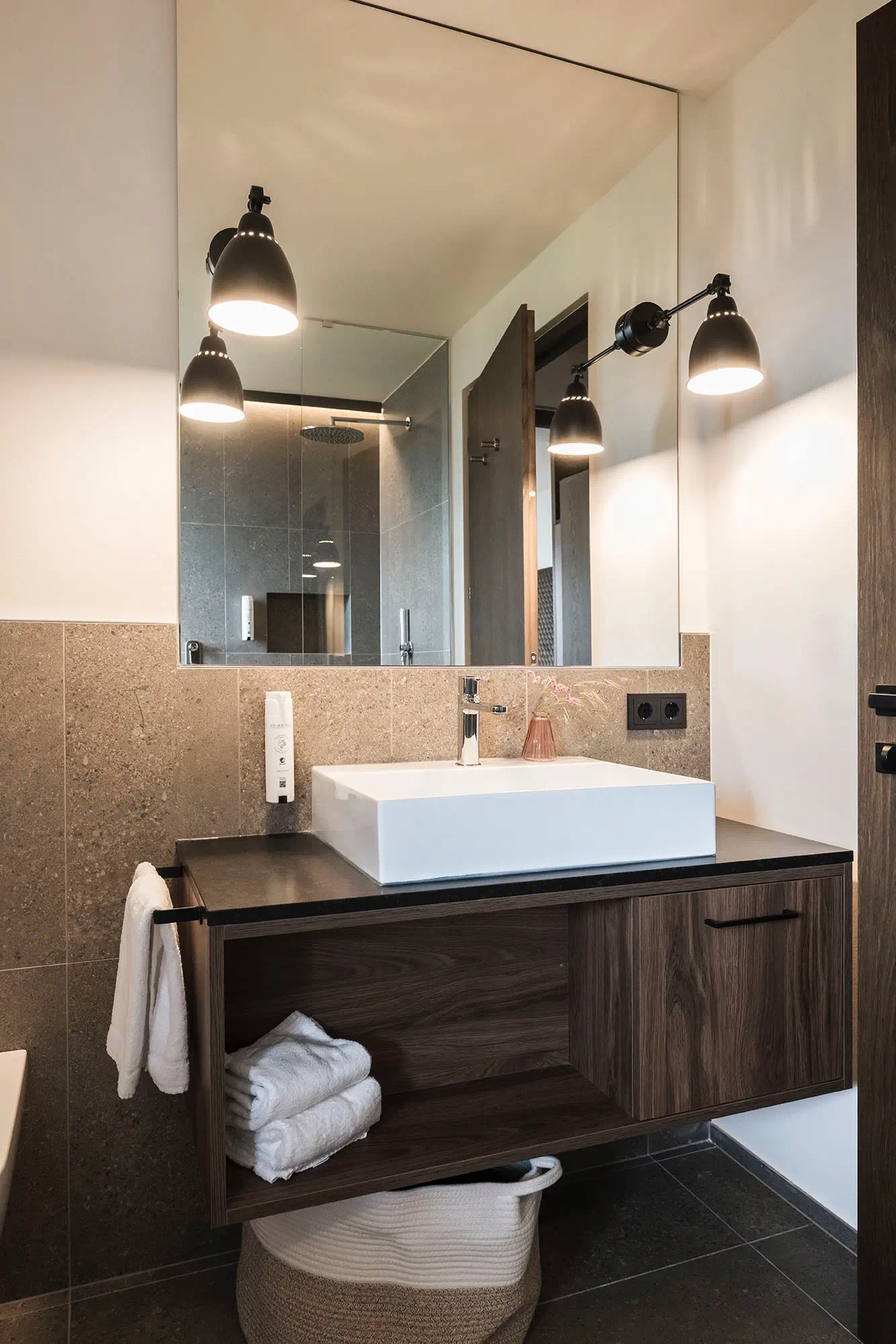 • Badezimmer mit Regendusche, WC, Bidet, Föhn und Handtüchern