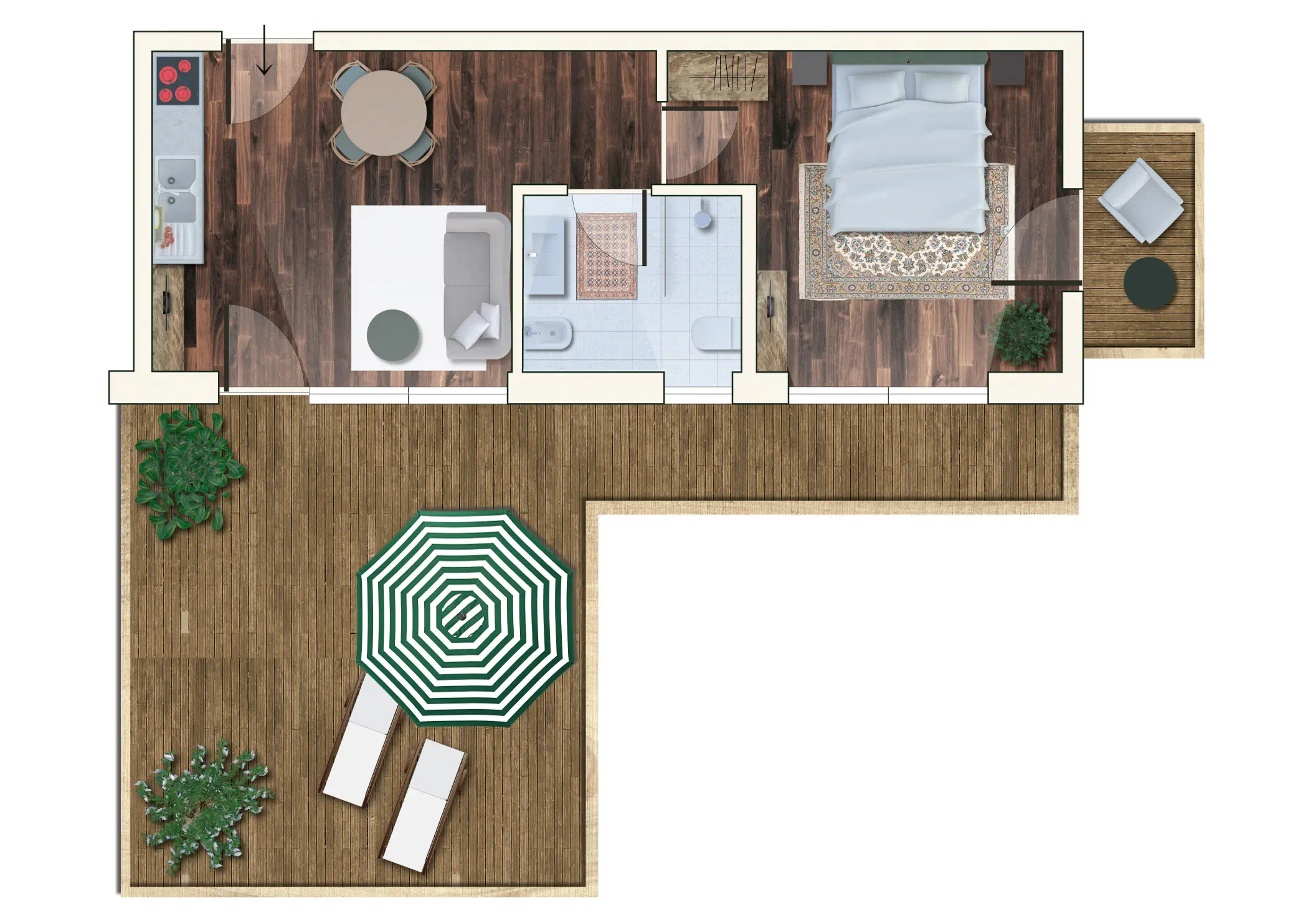 Studios für freiheitsliebende Urlauber mit Balkon oder Terrasse. Zum Weite Atmen und Entspannen.