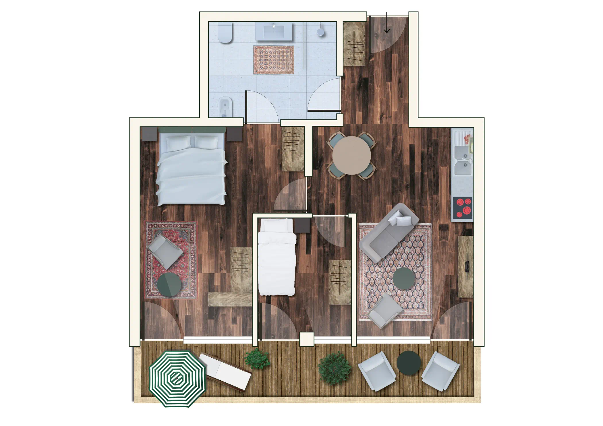 Studios für reiselustige Familien mit Balkon. Zum Erholen, Genießen, Zusammensein.