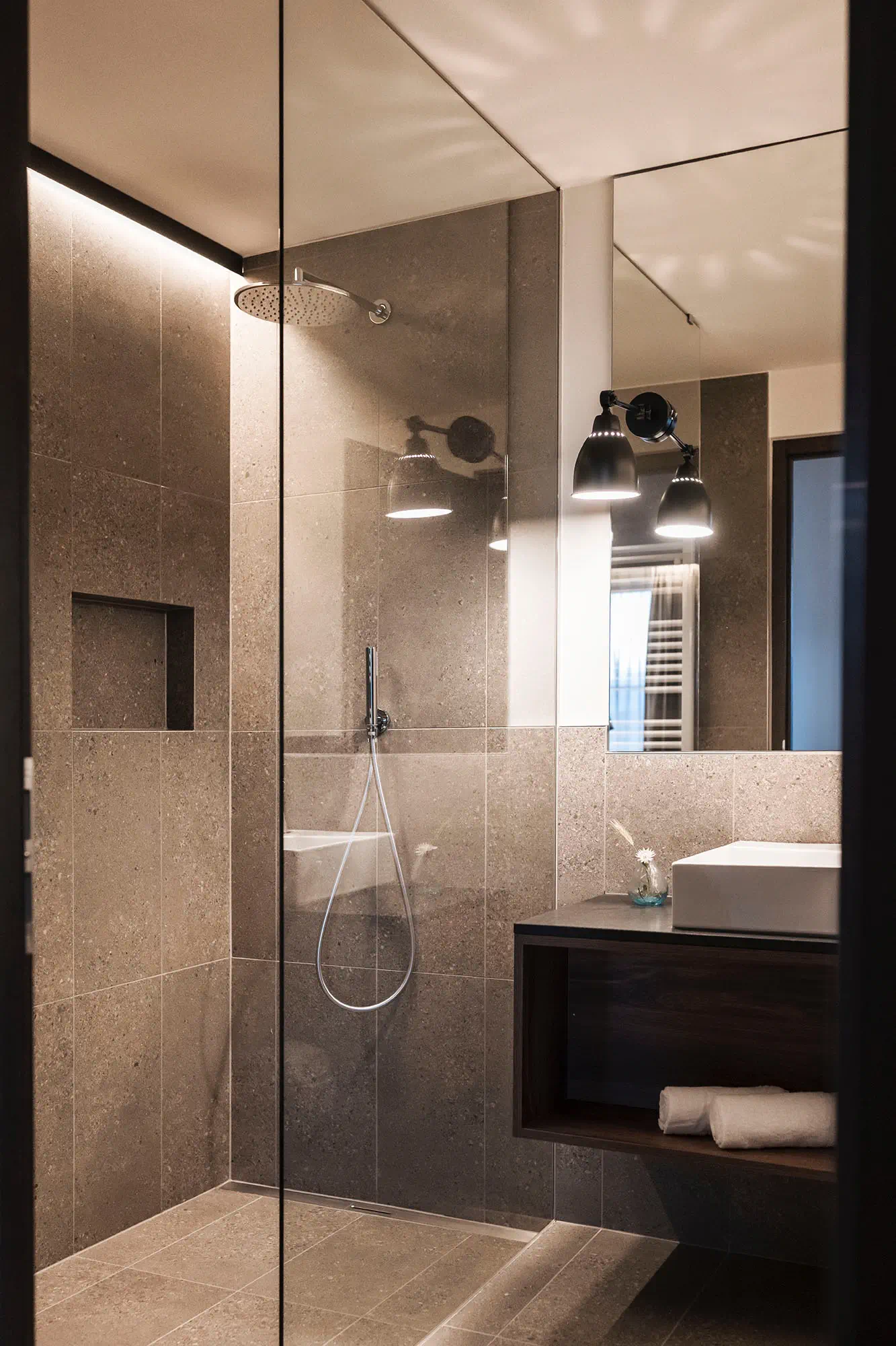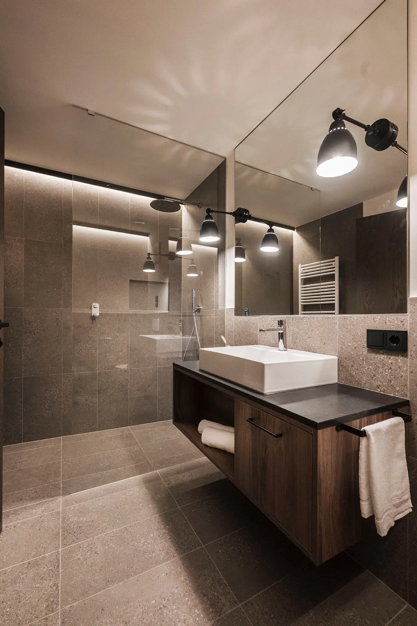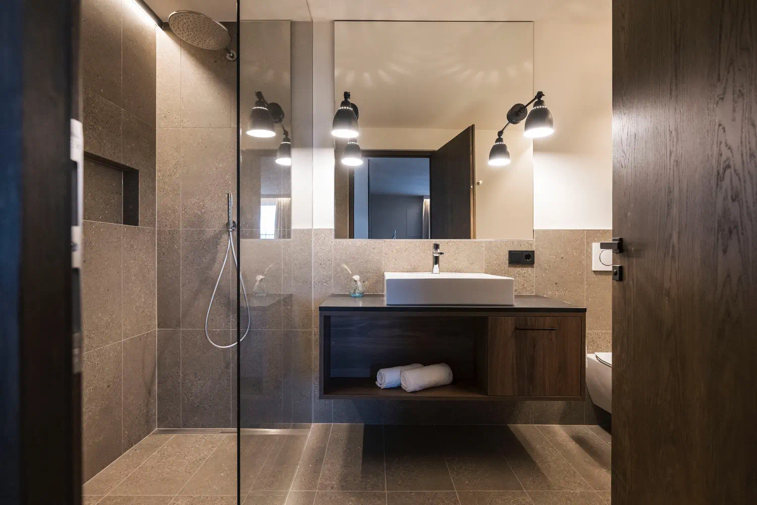 • Badezimmer mit Regendusche, WC, Bidet, Föhn und Handtüchern