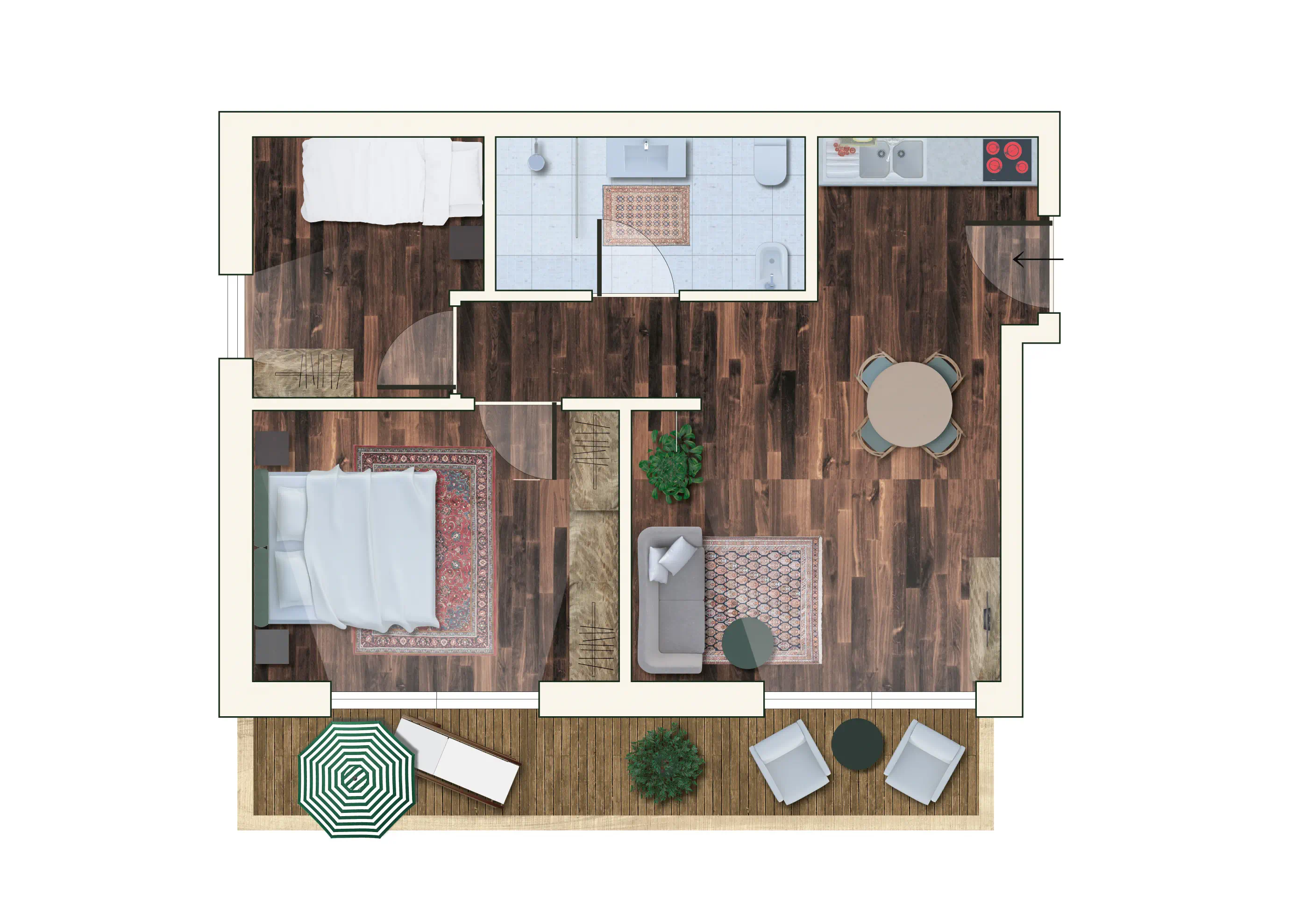 Studios für freiheitsliebende Familien mit großem Balkon oder Terrasse. Zum Ankommen, Runterkommen, Fröhlichsein.
