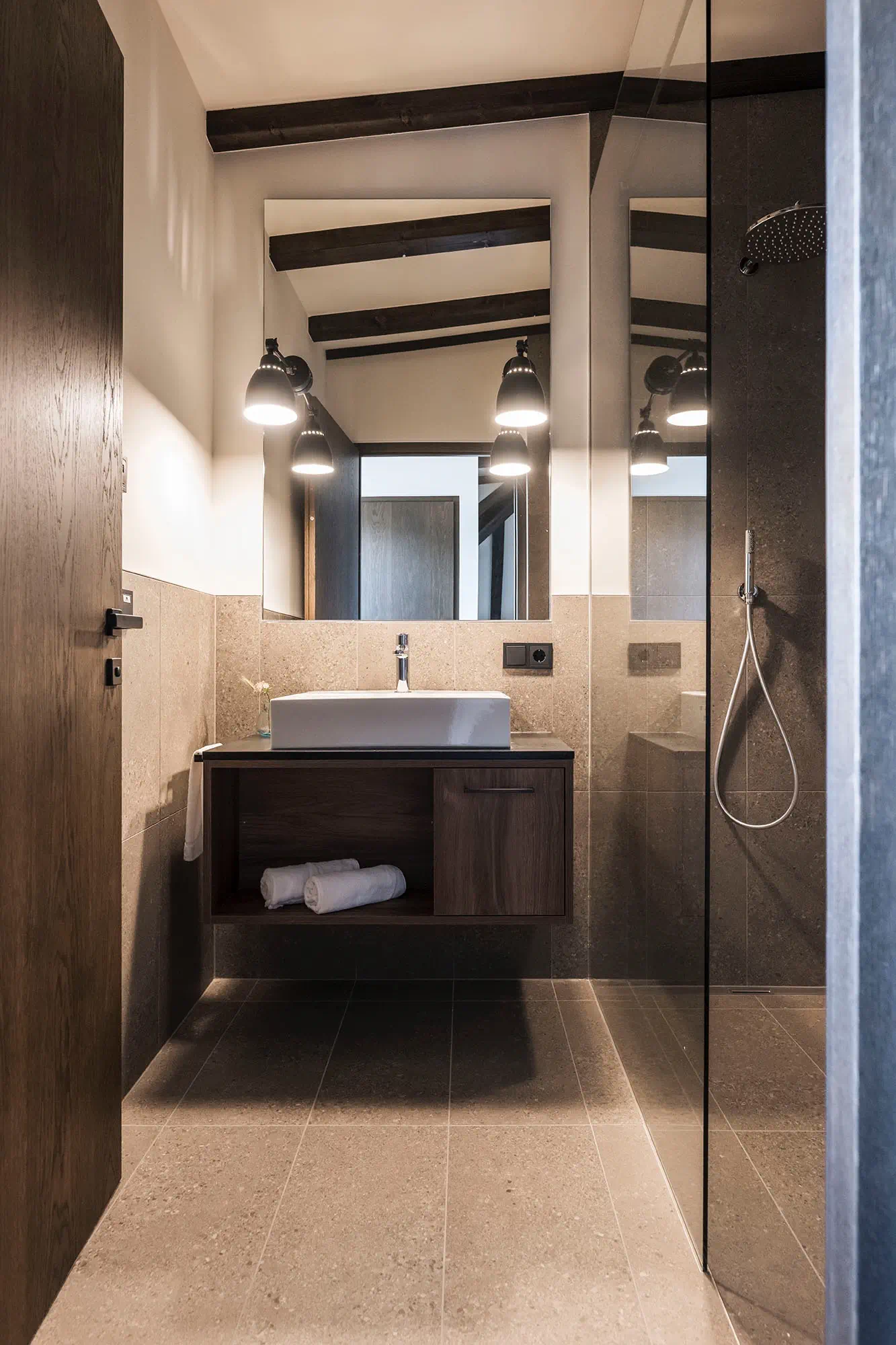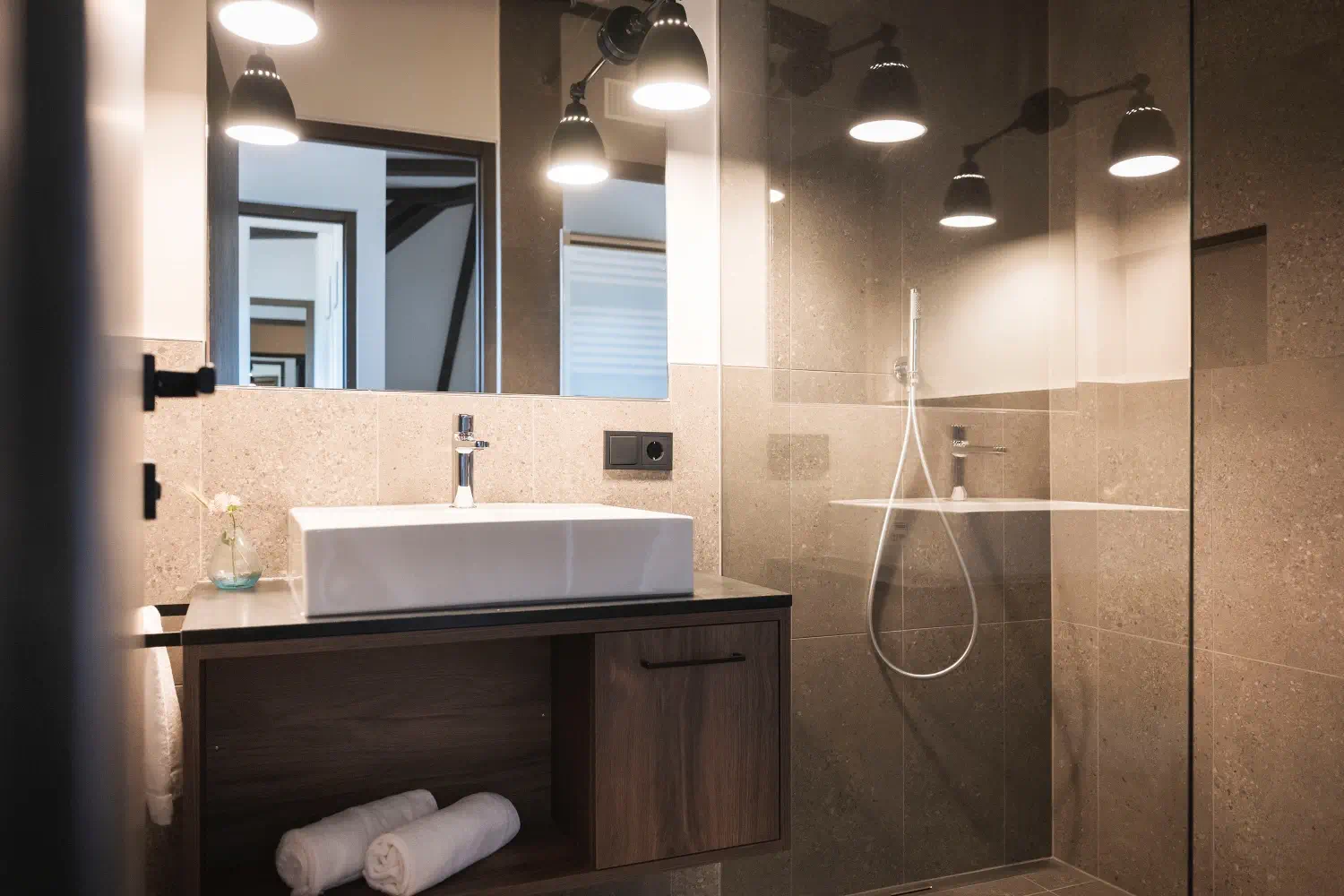 • Badezimmer mit Regendusche, WC, Bidet, Föhn und Handtüchern in der oberen Etage, Tages-WC in der unteren Etage