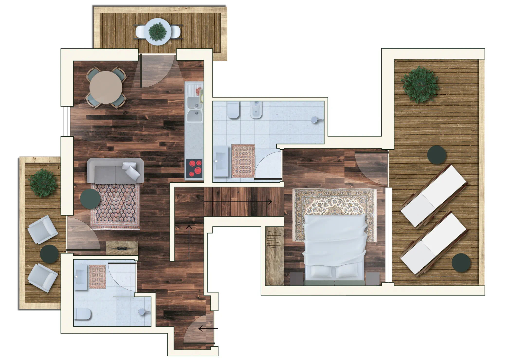 Studios über zwei Etagen mit Balkon und Terrasse für bewegungsfreudige Urlauber. Zum Bergluft Atmen und Genießen.