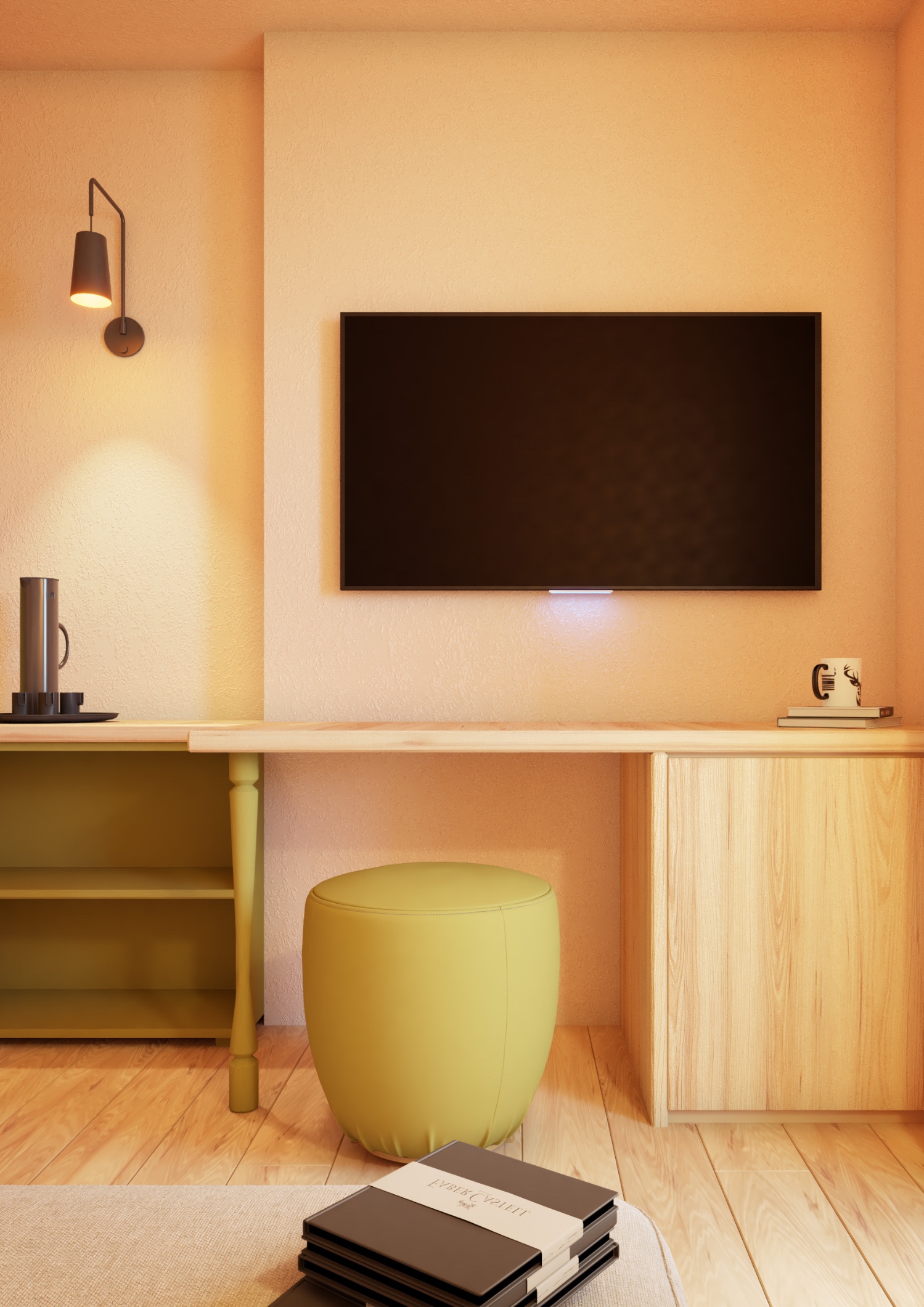 • Wohnbereich mit gemütlichem Sofa und Schreibtisch